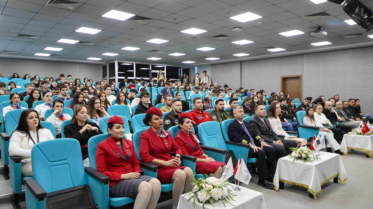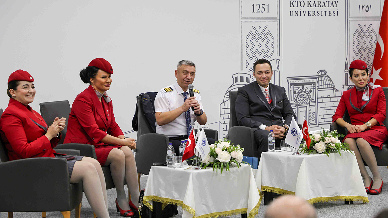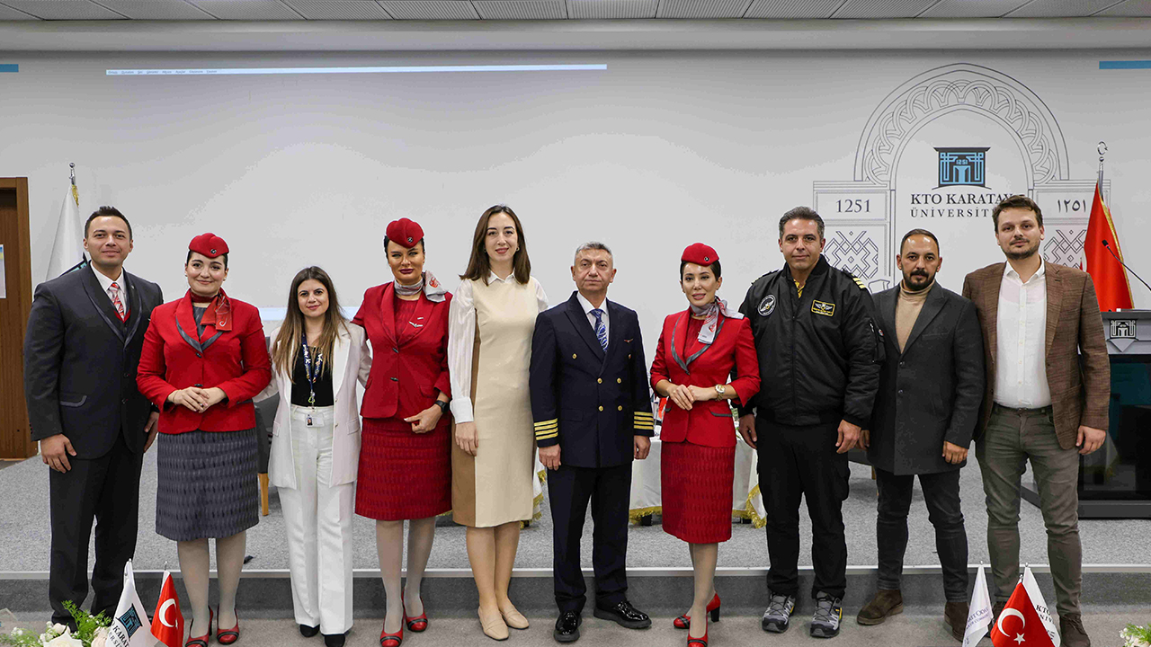 Mesleki bilgi paylaşımının yapıldığı ve sivil havacılık kurallarının ele alındığı konferans; KTO Karatay Üniversitesi Rektörü Prof. Dr. Fevzi Rifat Ortaç, Türk Hava Yolları Sorumlu Kaptan Pilotu Celal Bek, Türk Hava Yolları Kabin Amiri Yasemin Demirel, Türk Hava Yolları Kabin Memurları Tuğçe Özev, Enes Bilgin ve Alev Doğan’ın yanı sıra Sivil Havacılık Kabin Hizmetleri Programı ile Pilotaj Bölümü akademisyen ve öğrencilerinin yoğun katılımıyla gerçekleştirildi.