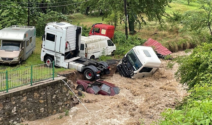 Toprak kaymasıyla birlikte otoparktaki bazı araçlar dereye devrilerek, su içinde kaldı.