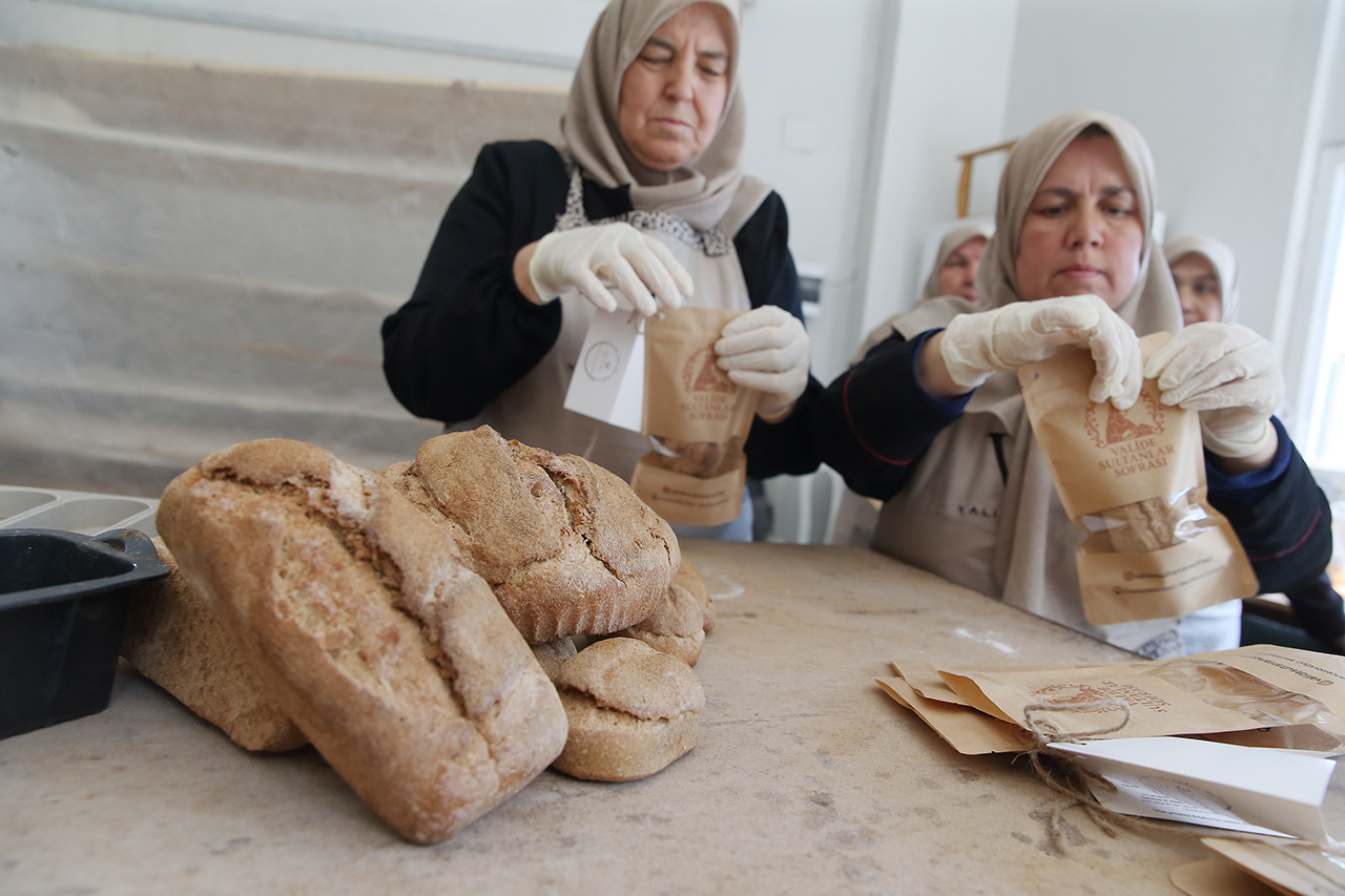 Köyde üretilen ata tohumu buğdayın taş değirmende un haline getirildiğini anlatan Topkara, "Özel kaya tuzu ve yerel pınar suyumuzu geleneksel yöntemlerle kullanarak unu hamura dönüştürüyoruz. Kooperatifimize üye hanımlar tarafından meşe odunu ateşinde pişirilen ekmekler, paketlenerek tüketiciye gönderiliyor." dedi.