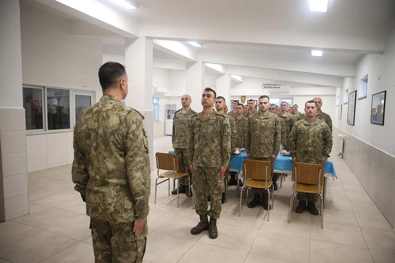 Yemekhanede yemek duasının ardından askerlerin yeni yılını kutlayan komutanlar, kulede nöbet tutan Mehmetçik'i ziyaret ederek yeni yılını tebrik etti, telefonla ailesiyle görüştürdü.
