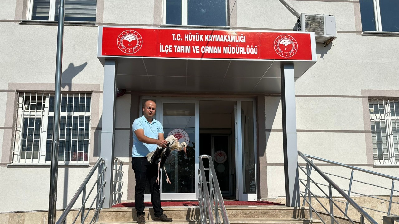 Hüyük Belediyesi Temizlik İşleri Müdürlüğüne bağlı işçiler Köşk kaplıcaları mevkisinde yaralı halde buldukları leyleği Hüyük İlçe Tarım Orman Müdürlüğü'ne teslim etti.