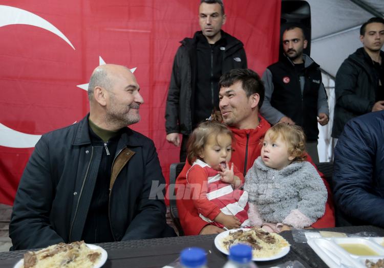 Hatay'ın Antakya ilçesi Ovakent Mahallesi'nde kurulan çadırdaki iftar programına katılan Soylu, sohbet ettiği depremzedelerle orucunu açtı.