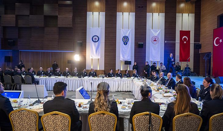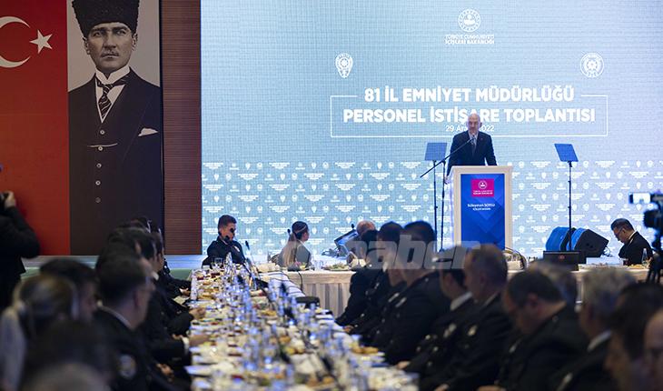 Bakan Soylu, Polis Müzesi Şehit Demet Sezen Konferans Salonu'nda düzenlenen "81 İl Emniyet Müdürlüğü Personel İstişare Toplantısı"nda bir araya geldiği polis memurlarına, Cumhurbaşkanı Recep Tayyip Erdoğan'ın selam ve sevgilerini iletti.