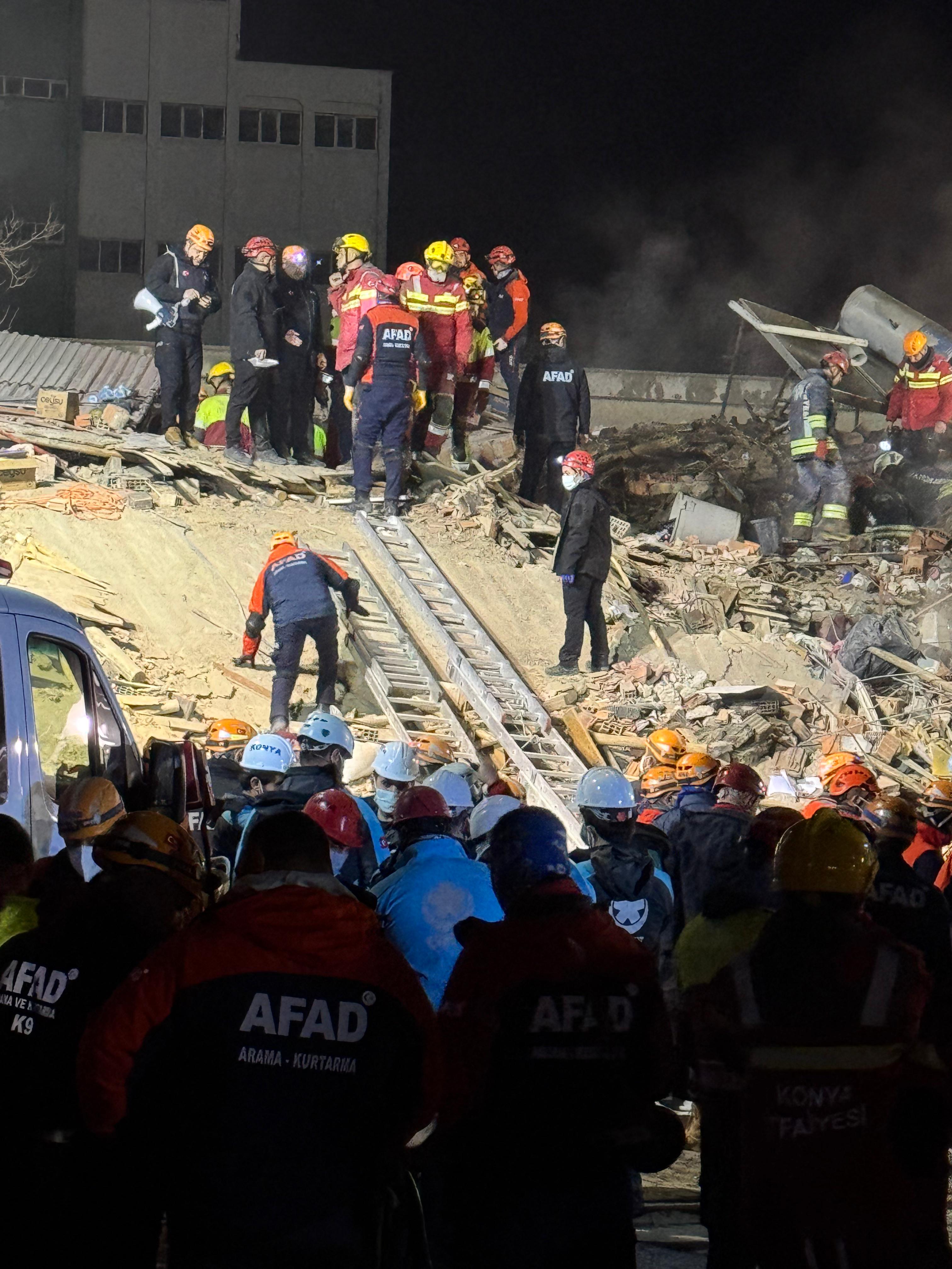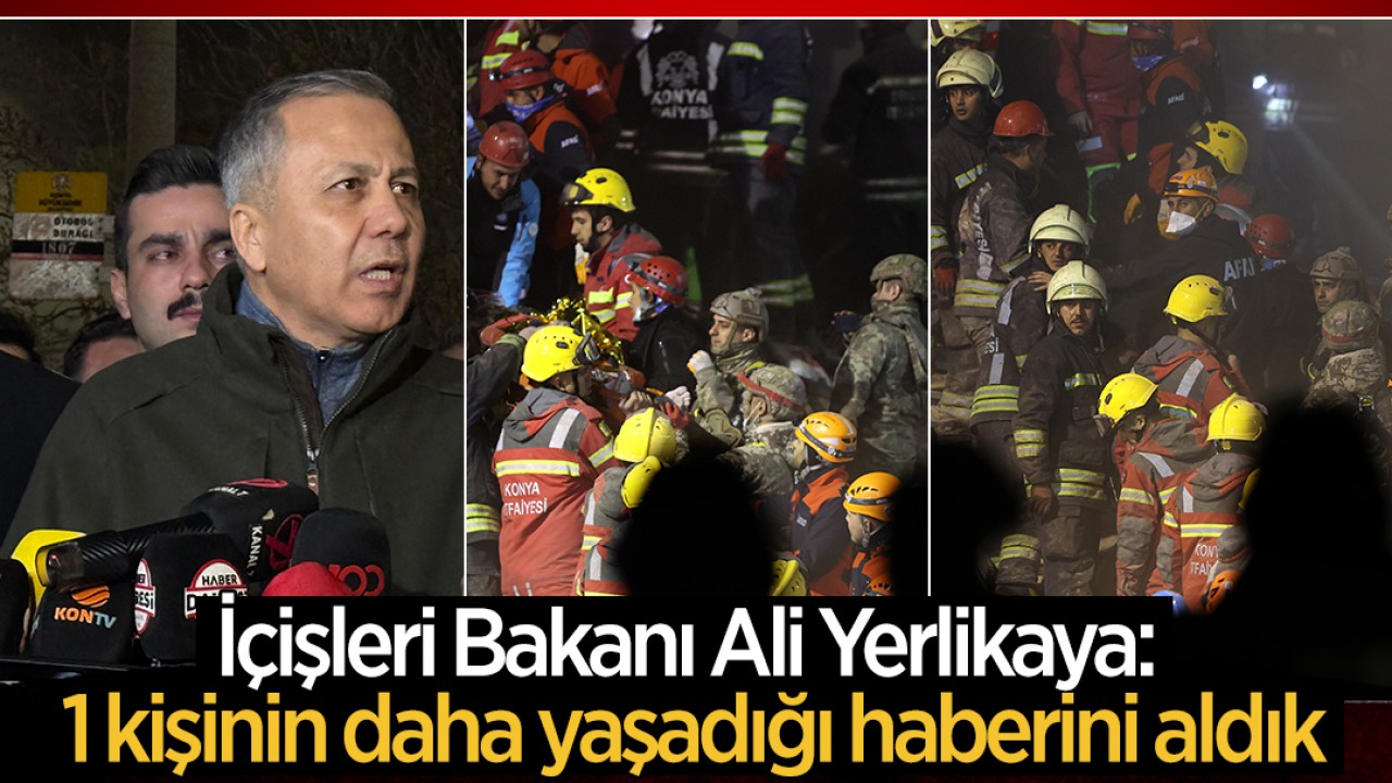 Yerlikaya, Konya Büyükşehir Belediyesi, emniyet, nüfus ve Göç İdaresi Başkanlığından bu kayıtlı nüfuslara telefonla ulaşıldığına işaret ederek şöyle konuştu: "Her biri tek tek arandı. Birden çok arandı, her biri kontrol edildi. Gördük ki 20.05'te içeride yaşayan 2 kişinin kendi imkanlarıyla kurtulduğunu, 5 kişinin içeride kaldığını, geride kalanların da her biriyle tek tek telefonla görüştük. Az önce size güzel bir haber verelim, 2 ambulans sesi duyduk. Arama kurtarma ekiplerimiz, 4 saat 15 dakika sonra bu çalışmalarla yaşayan 2 kişiyi kurtardı. Şu anda enkazın altında 3 kişinin olduğunu düşünüyoruz. Eğer beraberlerinde bizim bilmediğimiz, adres ve telefonla teyitle yapmış olduğumuz kontrollerde onların haricinde birisi daha varsa sayı daha fazla olabilir ama bizim kanaatimiz şu ki, orada enkaz altında 3 can olduğunu düşünüyoruz. Bir güzel haber daha 2 kişi sağ kurtulduktan sonra az önce AFAD başkanımız bir kişinin daha yaşadığıyla ilgili güzel bir haber getirdi. Temennimiz, bir an önce ona da ulaşmak. Diğer ikisiyle de ilgili beton enkazların arkasında bir bedenle ilgili o sistemle ilgili bir tarama yapıyoruz. Şu ana kadar onların yerini belirleyemedik."
