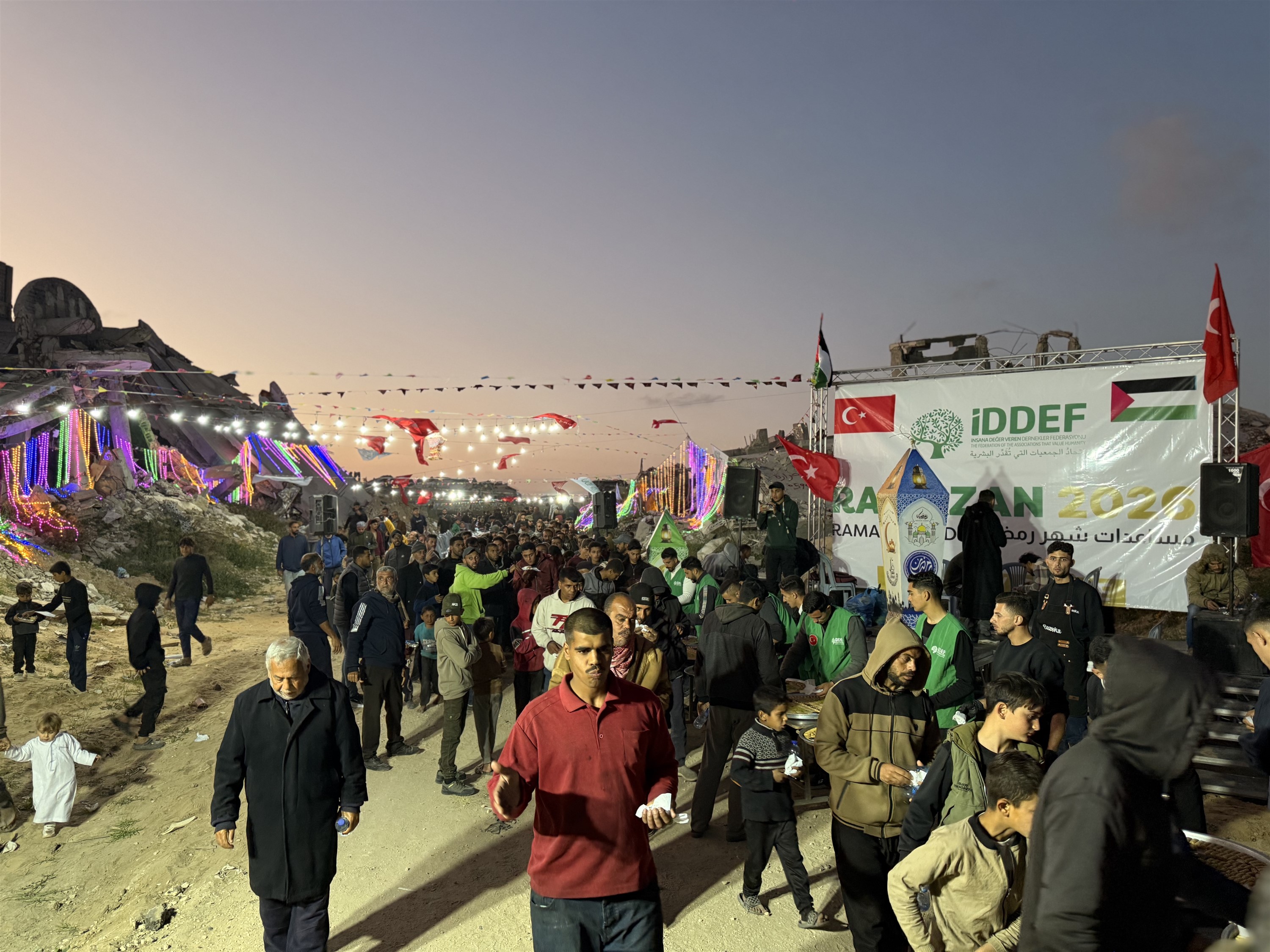 İDDEF ekipleri, 2026 yılı Ramazan çalışmaları kapsamında Gazze’de yüzlerce kişilik iftar organizasyonları düzenliyor. Moloz yığınlarının arasında kurulan sofralarda sıcak yemekler ikram edilirken, çocuklar için düzenlenen etkinlikler ve ilahi grubu eşliğinde gerçekleştirilen programlarla Ramazan’ın heyecanı yeniden hissediliyor.