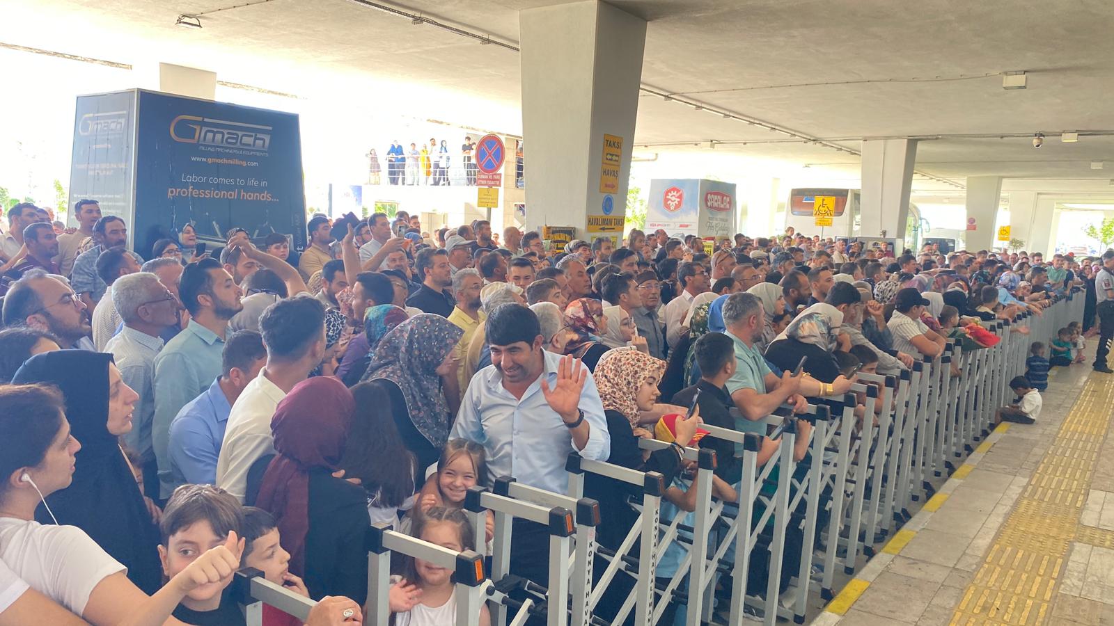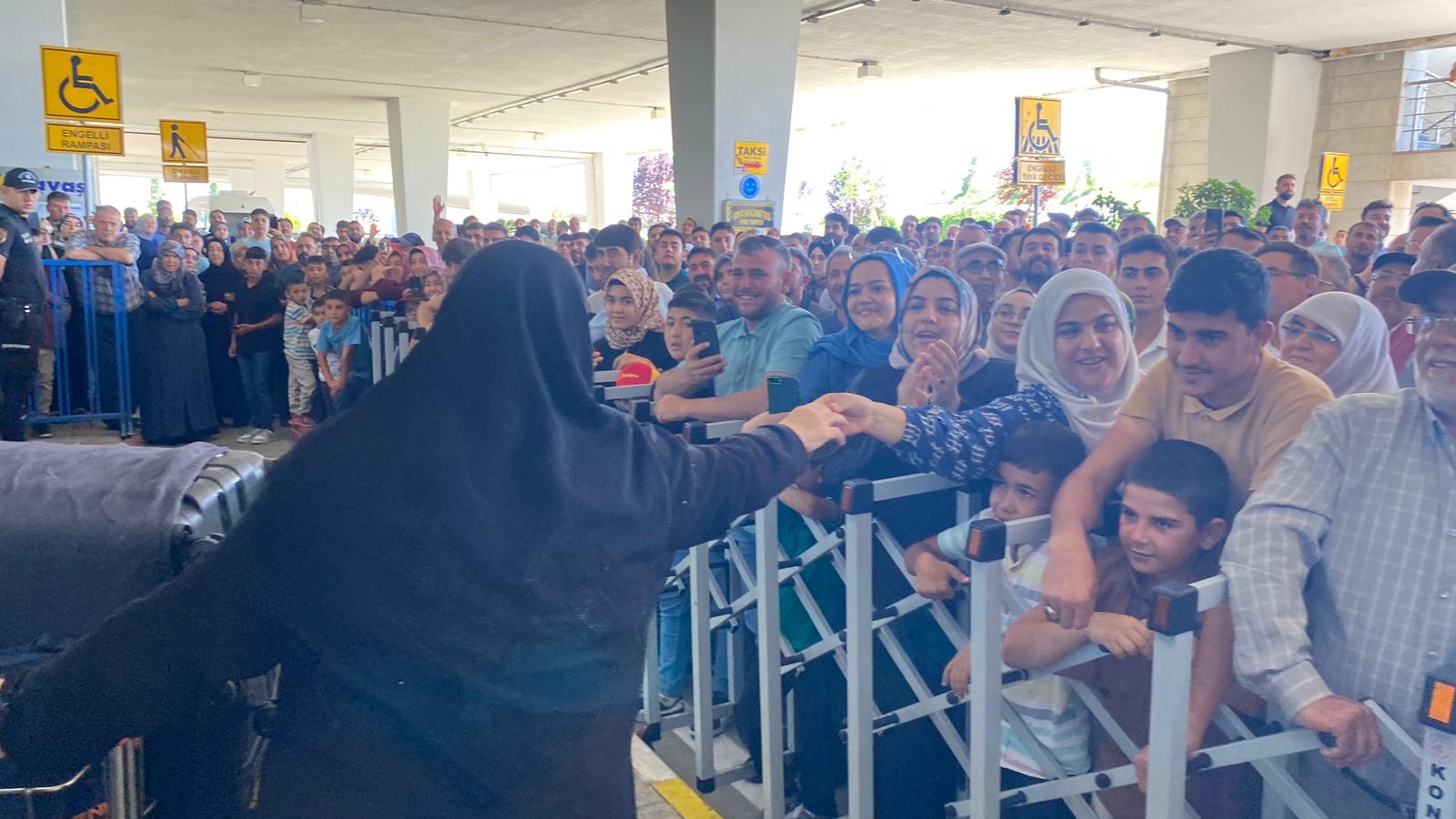 Konya Havalimanında sevdiklerine kavuşmanın mutluluğunu yaşayan hacılar ve yakınları gözyaşlarına hakim olamadı. (Yunus Köroğlu)