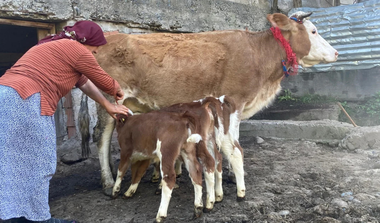 Artvin'in Kemalpaşa ilçesinde Tatar Ailesi'ne ait inek, nadir görülen şekilde dördüz doğurarak büyük şaşkınlık ve sevinç yaşattı.