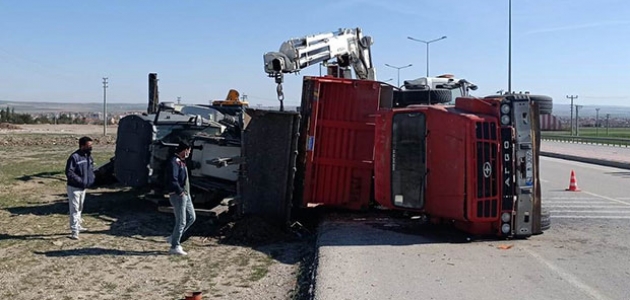 Konya’nın Kulu ilçesinde sürücüsünün direksiyon hakimiyetini kaybettiği iş makinesi yüklü kamyon yol kenarına devrildi.