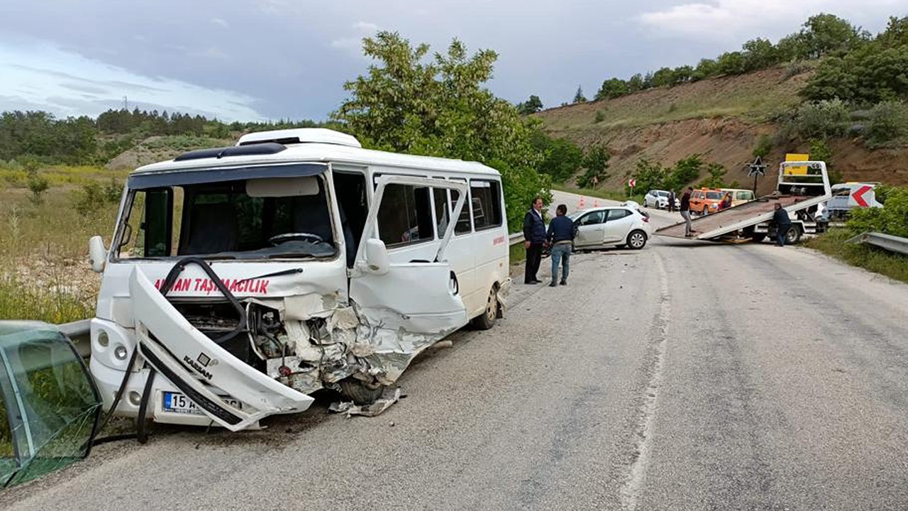 Kaza, dün akşam saatlerinde Karamanlı- Yeşilova kara yolu Bağlıorman mevkisinde meydana geldi. Tarım işçilerini taşıyan Yaşar C. (56) yönetimindeki 15 ABT 826 plakalı minibüs ile Fatih Tolga S. (27) idaresindeki 34 GDY 199 plakalı otomobil kafa kafaya çarpıştı.