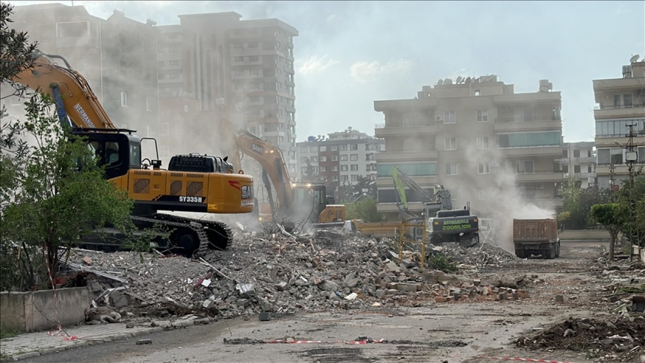 Kahramanmaraş merkezli 6 Şubat'taki depremlerden etkilenen Hatay'ın İskenderun ilçesinde ağır hasarlı binaların yıkımı ve enkaz kaldırma çalışmaları sürüyor.
