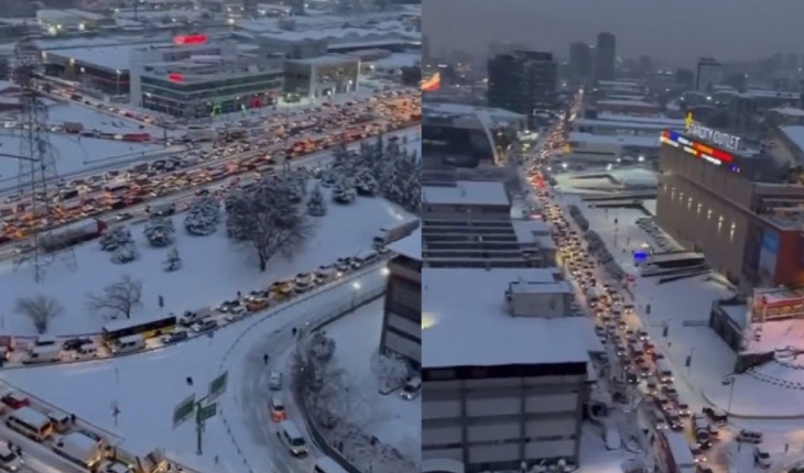 İstanbul Bahçelievler'de kar nedeniyle duran trafiğin boyutu, havadan çekilen görüntüye yansıdı.