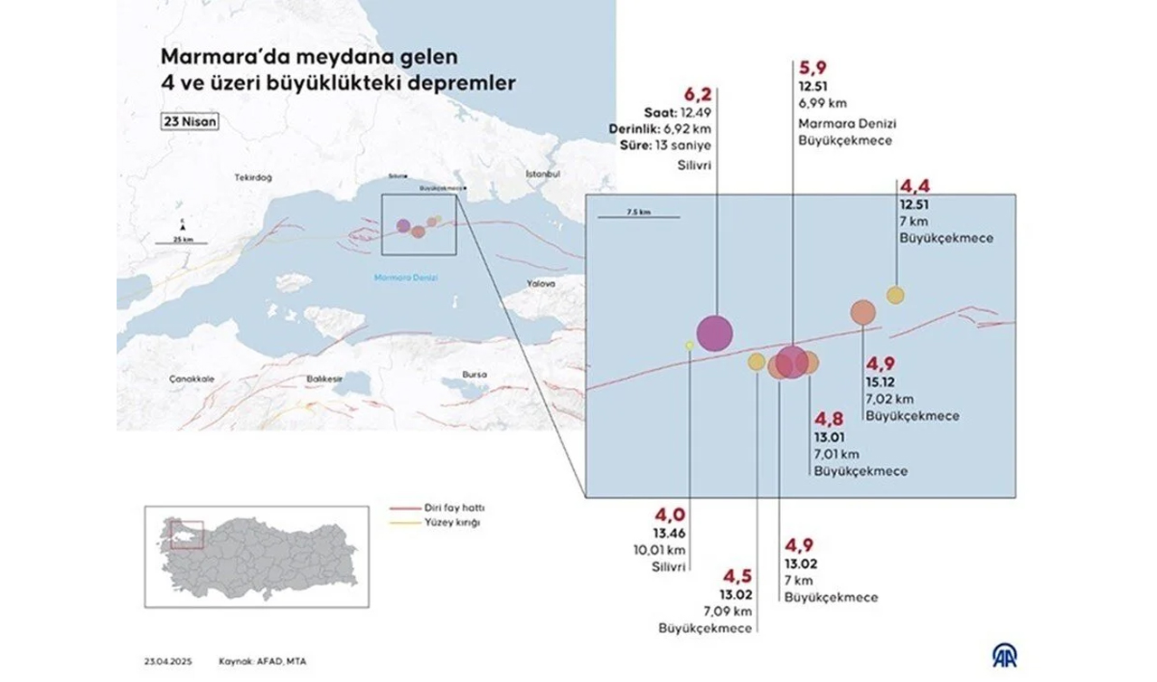 İstanbul'da 23 Nisan günü saat 12.49'da 6,2 büyüklüğünde deprem meydana gelmişti. 13 saniye süren depremde can kaybı ya da deprem kaynaklı yaralanma yaşanmamıştı. Megakentte büyük paniğe neden olan deprem sonrasında çok sayıda artçı deprem kaydedilmişti.