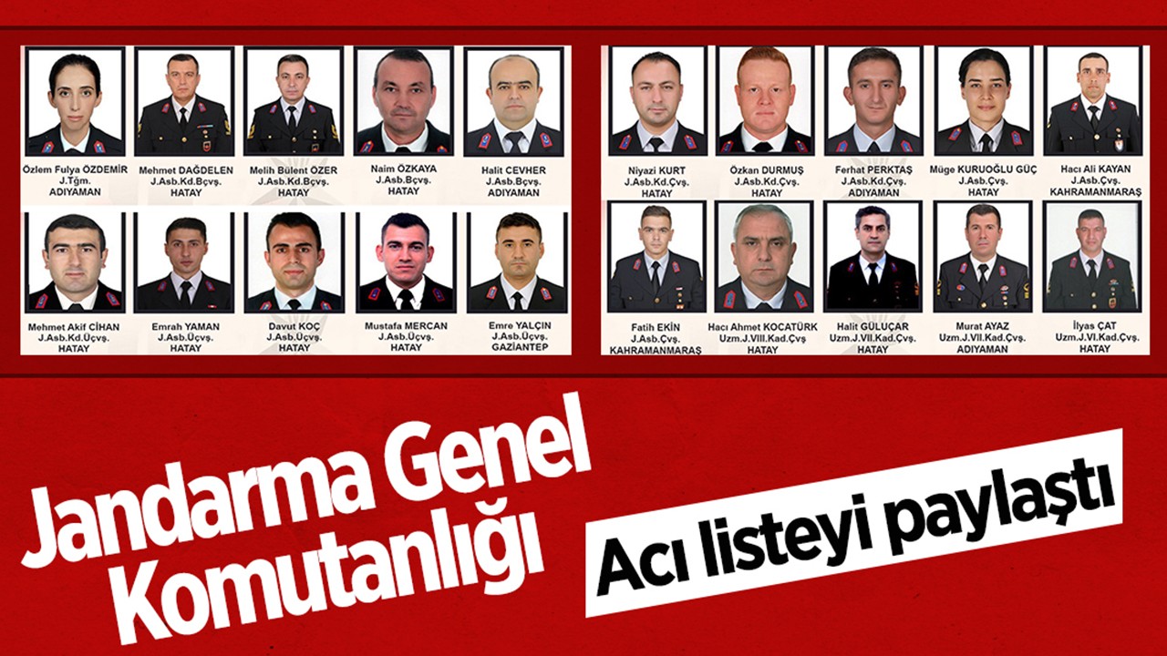 Jandarma Genel Komutanlığı Twitter hesabından yapılan paylaşımda, deprem şehidi jandarma personellerinin kimlik bilgileri, fotoğrafları, görev ve rütbelerine yer verildi. Paylaşıma, “Merkez üssü Kahramanmaraş olan depremlerde hayatını kaybeden silah arkadaşlarımıza Allah’tan rahmet, ailelerine ve Türk Milleti’ne başsağlığı dileriz” notu eklendi.
