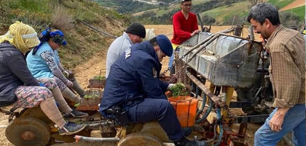 Denizli’nin Buldan ilçesinde devriye atan jandarma ekipleri, kekik dikimi yapan çiftçiye yardım ederek makinenin üstüne çıkıp dikim yaptı.