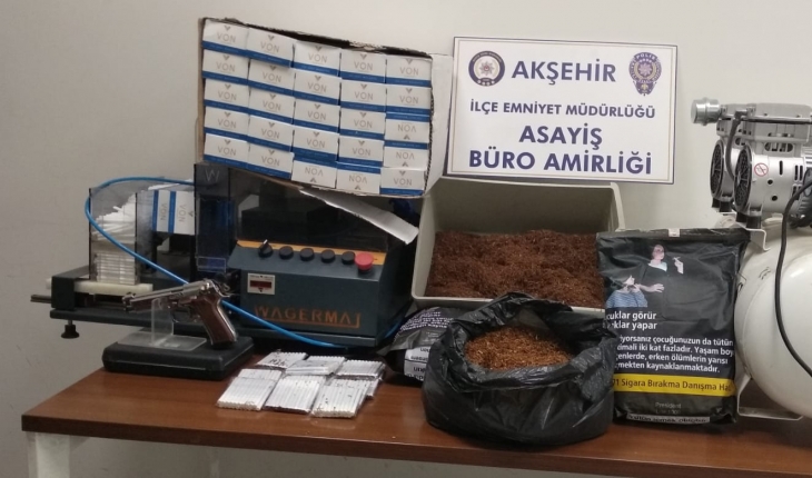 Akşehir'de 10 bin 200 adet boş makaron, 320 adet tek dal doldurulmuş sigara, dört kilogram kaçak kıyılmış tütün ve bir adet kurusıkı tabanca ele geçirilen operasyonda 1 kişi gözaltına alındı.