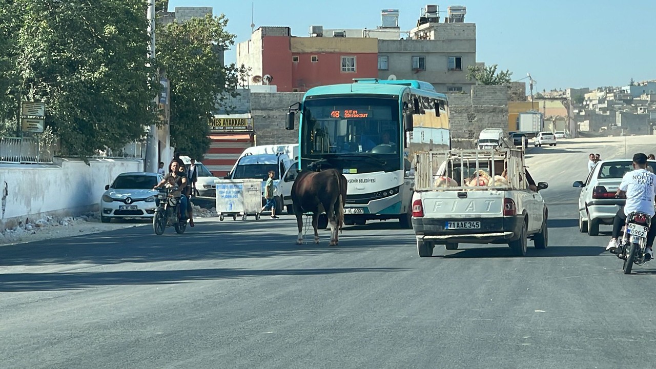 Eyyübiye Mahallesi'nde sabah saatlerinde Halil Yıldırım’a ait kurbanlık boğa kesilmek istendiği sırada sahibinin elinden kaçtı. Çevredekilerin uğraşlarına rağmen boğa yakalanamadı.