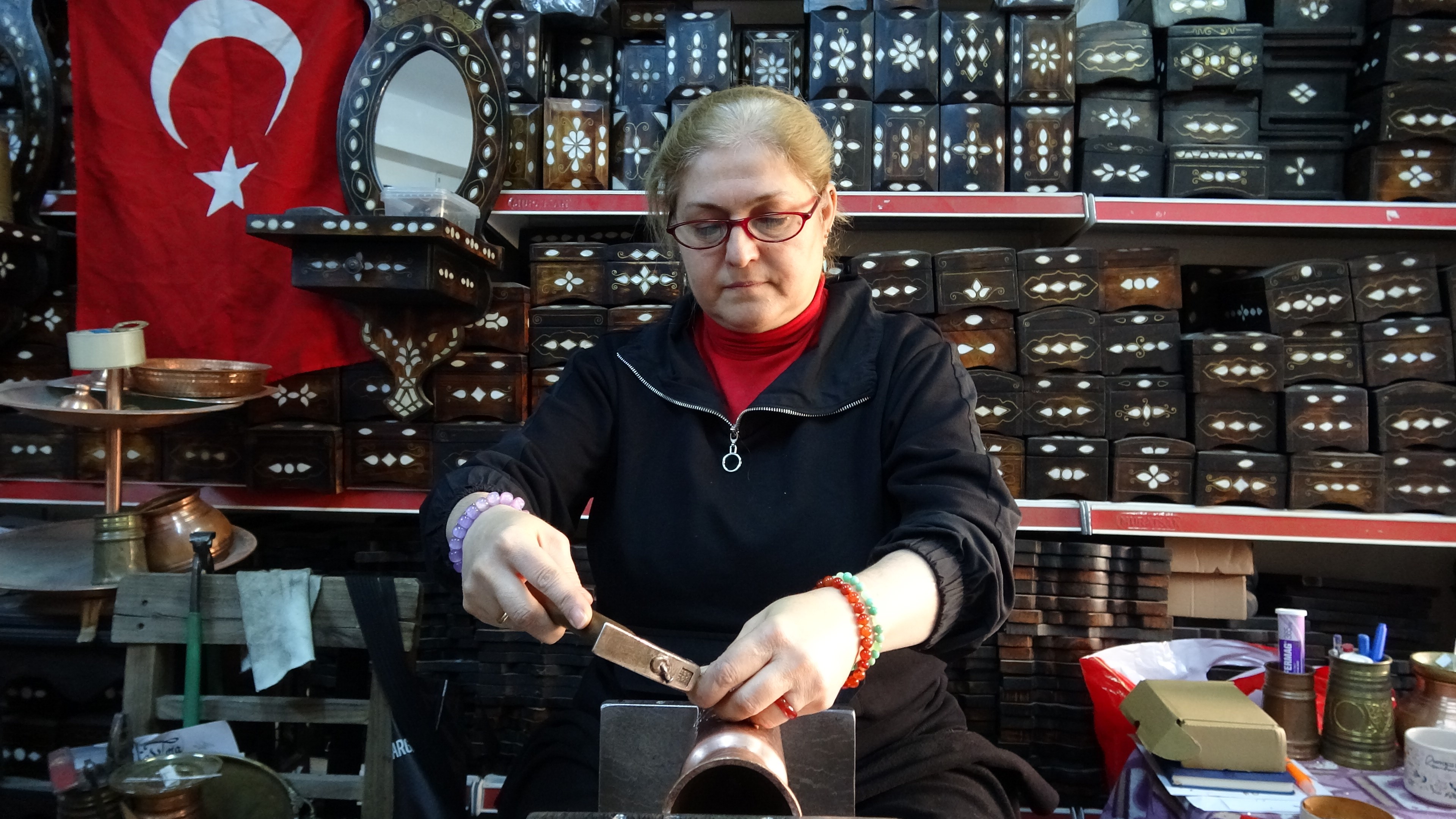 Gaziantep'te ev hanımı iken katıldığı kursta unutulmaya yüz tutmuş bakır işlemeciliği mesleğini öğrenen 54 yaşındaki Emine Sibel Bakırcı, maharetleriyle adeta erkeklere taş çıkartıyor.