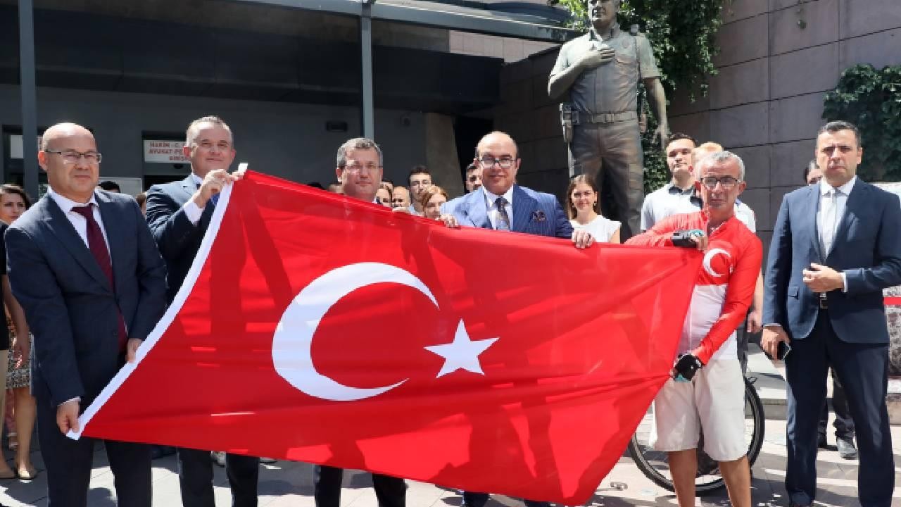 Şehitler anısına çıktığı bisiklet turlarıyla tanınan Orhan Kotluk, İzmir Adliyesinden teslim aldığı Türk bayrağını şehit polis memuru Fethi Sekin'in memleketi Elazığ'a götürmek üzere bisikletle yola çıktı.
