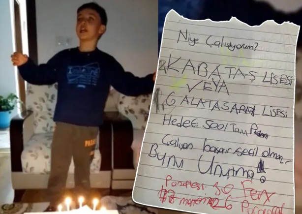 Görüntülerde neşesiyle dikkat çeken küçük Adnan'ın, pastasındaki mumları üflemeden önce sınavlardan yüksek ve tam puan almayı dilediği anlar yürek burktu. Masasında yer alan "Kabataş Lisesi veya Galatasaray Lisesi" yazılı not ise hayallerinin büyüklüğünü bir kez daha gözler önüne serdi.
