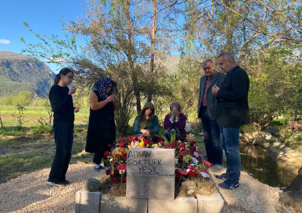 Düziçi ilçesindeki Yeşil Mezarlığı'nda bulunan Adnan'ın kabrini ziyaret eden ailesi, arkadaşları ve vatandaşlar çiçekler bırakıp dualar ediyor.