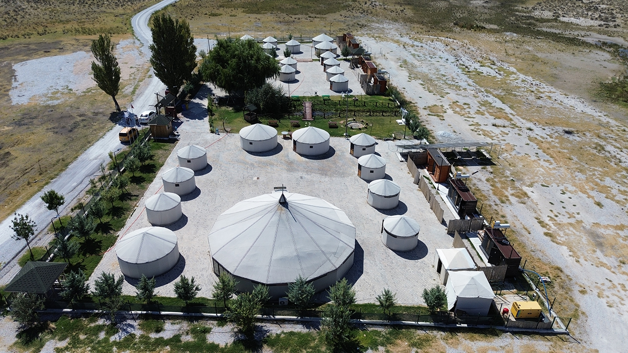 Aksaray'ın Eskil ilçesinde kıl çadırlarla kurulu Tuz Gölü Obası, tuz odalarıyla ziyaretçilerine alternatif tatil imkanı sunuyor.