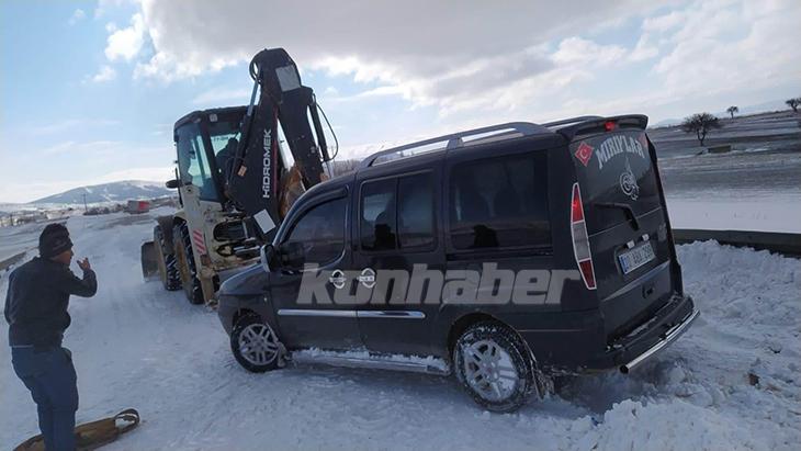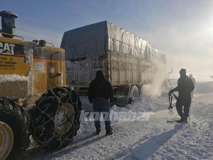 Konya’nın Hüyük ilçesinde etkili olan kar yağışı ve kar fırtınası nedeniyle yollarda oluşan sürgün nedeniyle ulaşıma kapanan yollarda mahsur kalan araçları kurtarabilmek için tüm kurumlar seferber oldu.