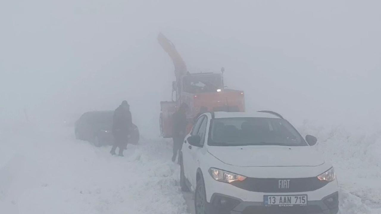 Muş'un Hasköy ilçesi ile Bitlis'in Mutki ilçesi arasındaki kara yolunun Kaymakam Çeşmesi mevkisinde, öğleden sonra etkili olan kar ve tipi nedeniyle 22 araç mahsur kaldı.