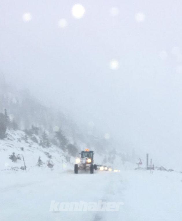 Konya'yı Antalya'ya bağlayan Seydişehir-Antalya kara yolunun 1825 rakımlı Alacabel mevkisinde aralıklarla devam eden kar yağışı etkisini sürdürüyor.