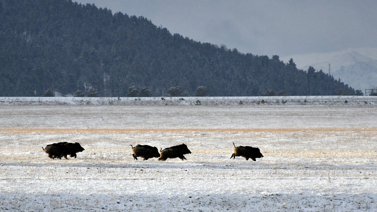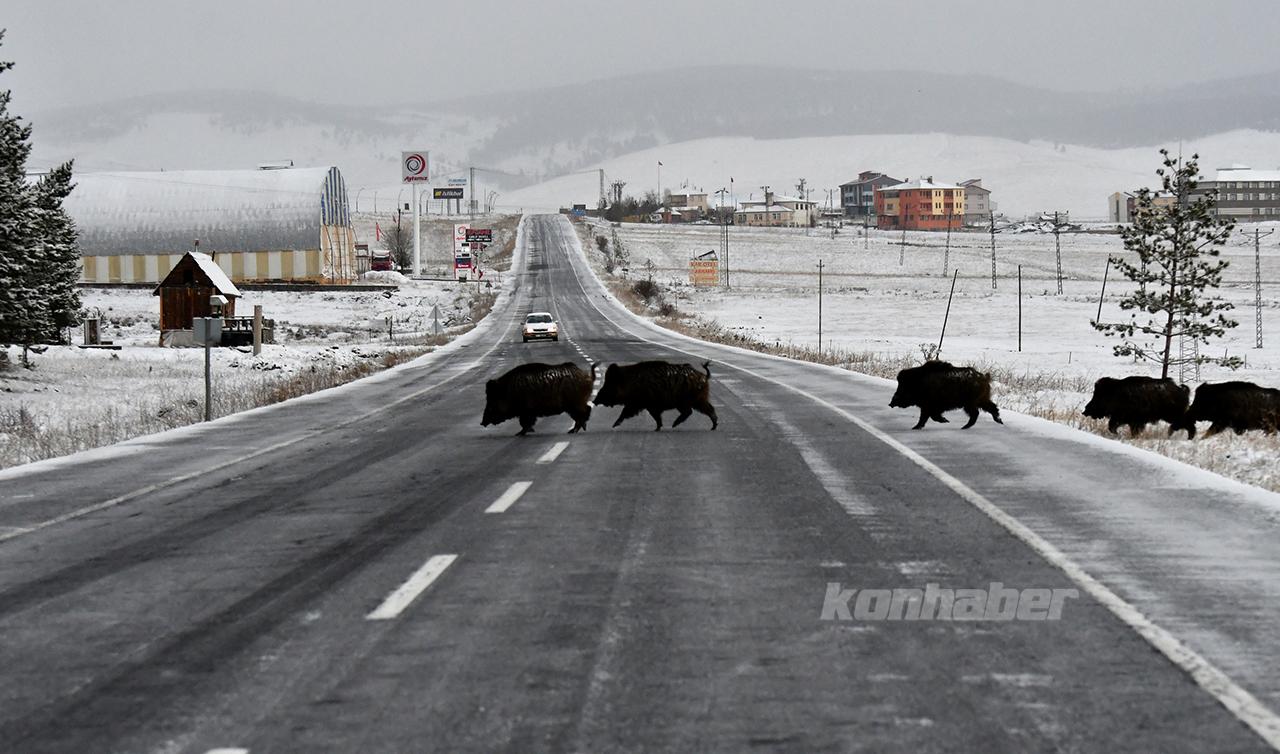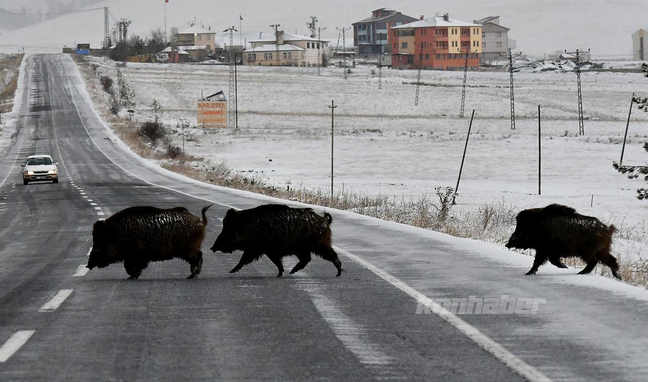Kars'ın Sarıkamış ilçesinde kara yoluna inen yaban domuzları sürü halinde görüntülendi.