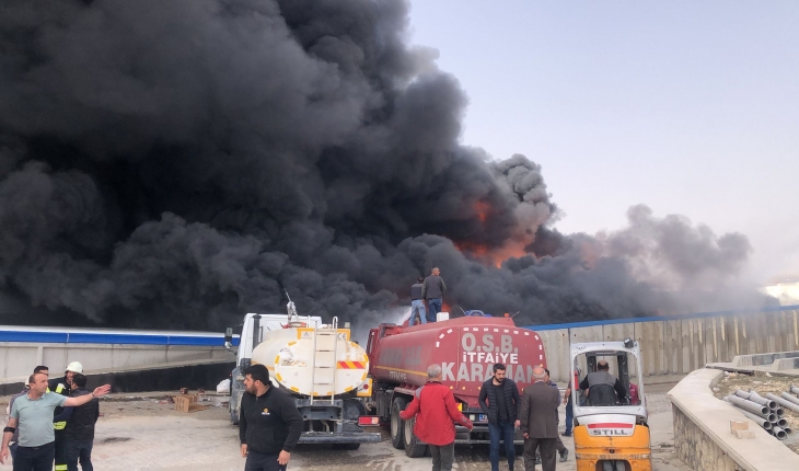 Karaman Organize Sanayi Bölgesinde (OSB) plastik malzeme üreten bir fabrikada çıkan yangına müdahale ediliyor.