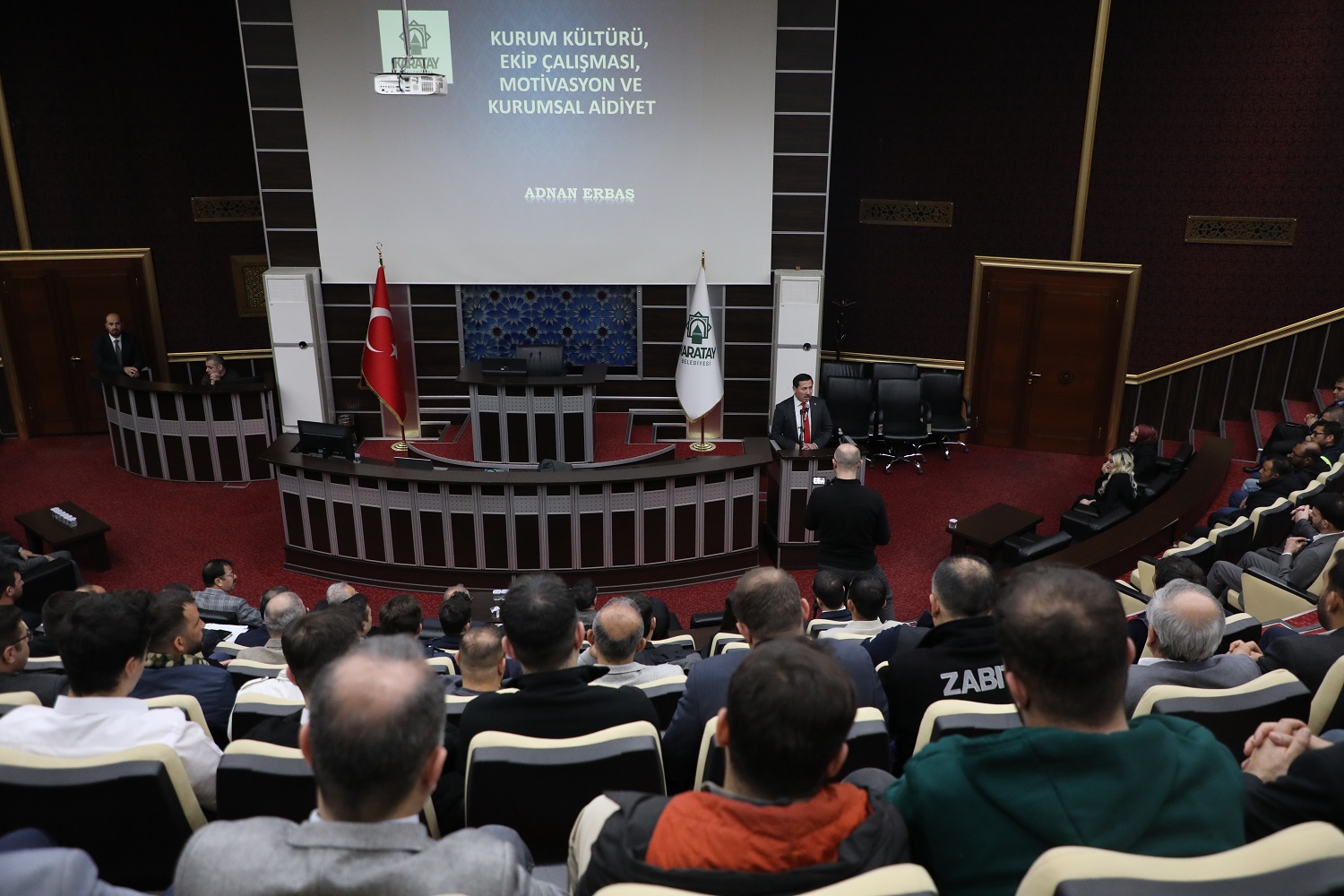 Seminerde konuşan Karatay Belediye Başkanı Hasan Kılca da, seminerin çalışanların kurum kültürünü benimsemesine, ekip ruhunu güçlendirmesine ve motivasyonlarını arttırmasına katkı sağlayacağını ifade etti.
