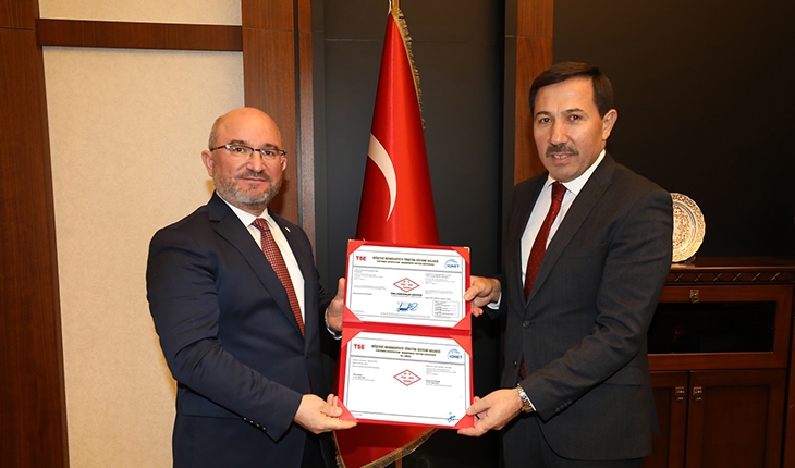 TSE Başkanı Mahmut Sami Şahin, yürütülen çalışmalar ve personele yönelik verilen eğitimler sonucunda Karatay Belediyesi’nin almaya hak kazandığı “TS ISO 10002 Vatandaş Memnuniyeti Yönetim Sistemi Belgesi”ni Karatay Belediye Başkanı Hasan Kılca’ya takdim etti.