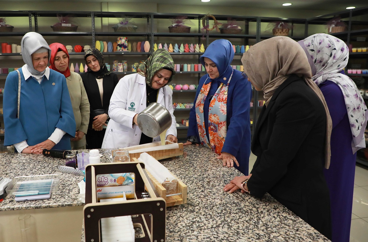 Heyet, Atölye Karatay’da kadınlar tarafından üretilen doğal kremler, lavanta sabunu, lavanta yağı, gibi birçok ürünü yerinde inceledi. Sabun üretimini bizzat deneyimleyen Genel Başkan Tuğba Işık Ercan, üretim süreci hakkında bilgi aldı.