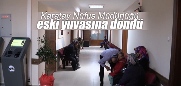 Karatay Nüfus Müdürlüğü yeniden Karatay’da hizmet vermeye başladı. Geçici bir süreliğine Selçuklu İlçesindeki İl Nüfus Müdürlüğünde hizmet veren Karatay Nüfus Müdürlüğü Mevlana Caddesindeki eski yuvasına döndü.