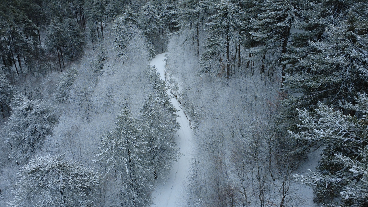 Drone ile kaydedilen görüntülerde, karla kaplanan dağ silsileleri, ormanlık alanlar ve kıvrılarak uzanan yollar görsel bir şölen sundu.