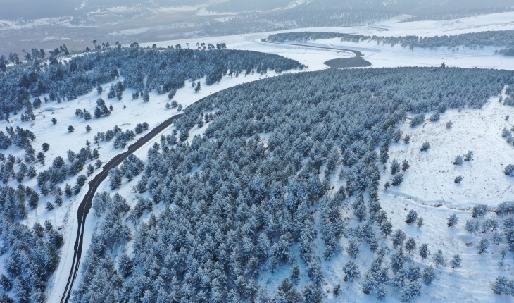 Boz ayı, vaşak, kurt, tilki başta olmak üzere birçok yaban hayvanına doğal yaşam alanı sunan sarıçam ormanlarını, önceki günlerde etkili olan karla beyaz örtü kapladı.