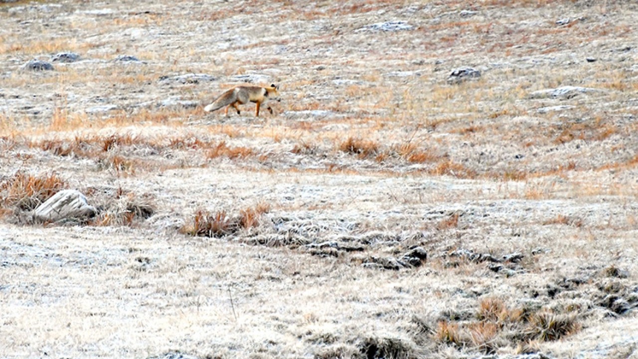 Kırağı ile beyaza bürünen arazide bir tilkinin yiyecek aradığı görüldü.