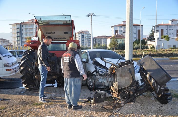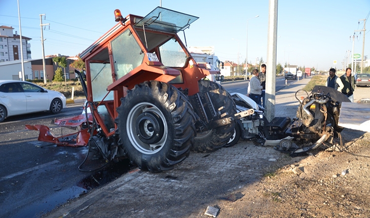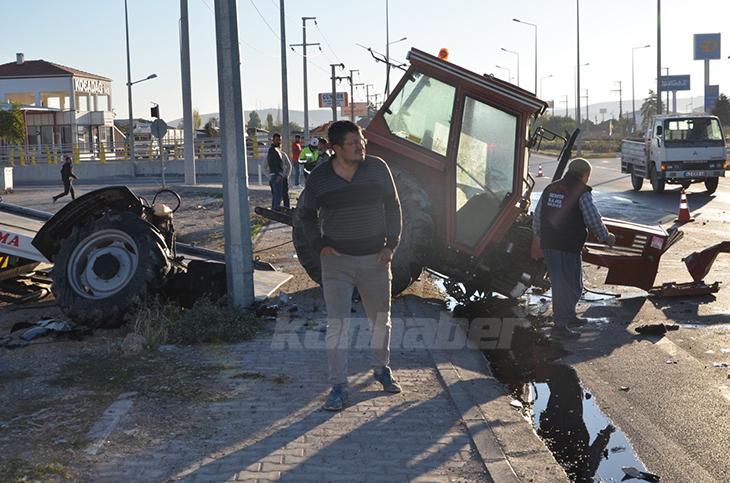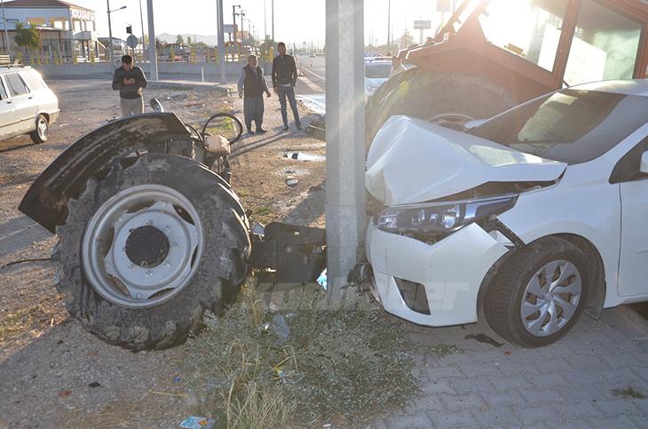Çarpışmanın şiddetiyle savrulan traktör iki bölünürken, otomobil ise kaldırımdaki aydınlatma direğine çarparak durabildi.