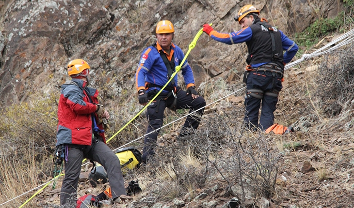 Kayalıklara bağlanan iple aşağı sarkıtılan AFAD personeli, beline ip bağladığı keçileri kurtardıktan sonra arkadaşlarının yardımıyla yukarı çekildi.