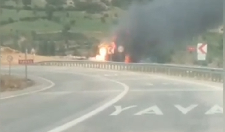 Karaman'ın Ermenek ilçesinde virajı alamayan tüp yüklü kamyonet kontrolden çıkarak bariyerlere çarptı. Alev alan araçta ardı ardına patlamalar meydana geldi. O anlar cep telefonu kamerasına yansıdı.