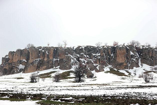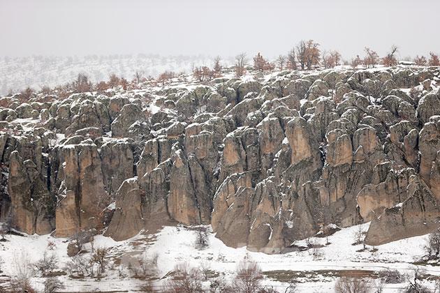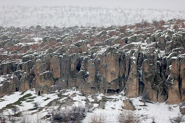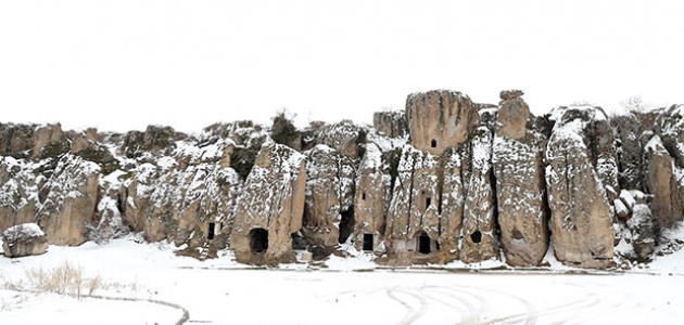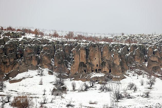Konya'nın merkez Meram ilçesinde, oluşumuyla Kapadokya'yı andıran Kilistra Antik Kenti, kar yağışıyla beyaza büründü.