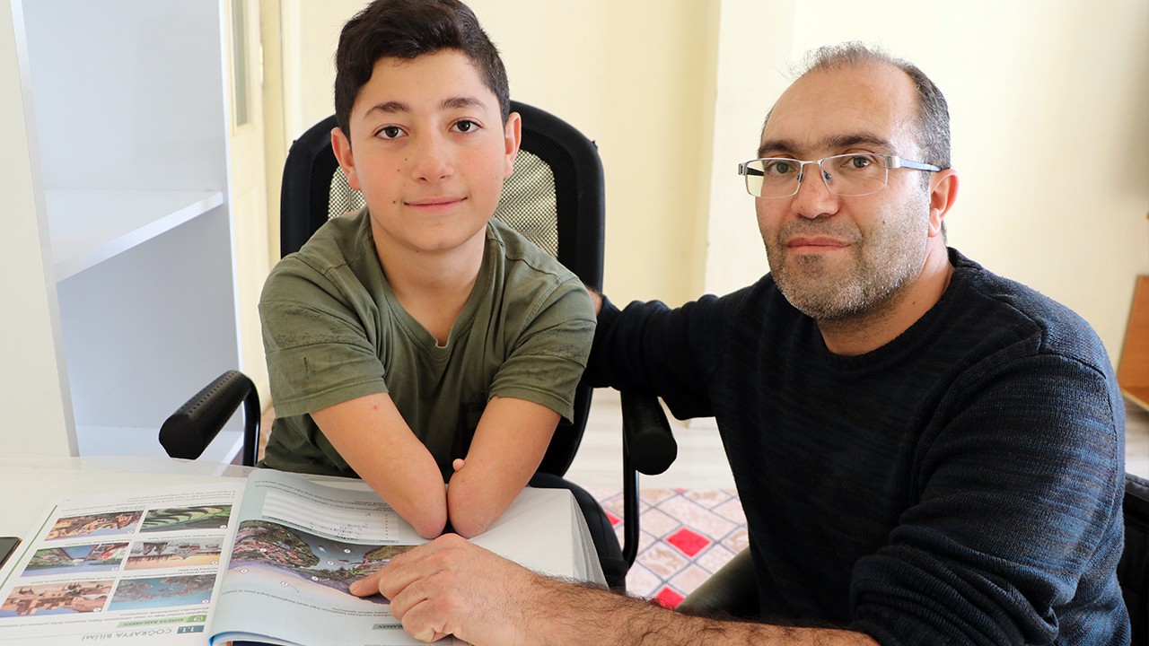 Van'ın Tuşba ilçesinde doğuştan dirsek altından kolları, diz altından da bacakları olmadığı için ilk ve ortaokulu evinde aldığı eğitimle tamamlayan Nakşin Özdemir (15), lise eğitimine de evinde devam ediyor. Vali Ali Haydar Bey Anadolu Lisesi 9'uncu sınıf öğrencisi Özdemir, "Geçen yıl aldığım protez kol ve bacaklar bana küçük gelince zorlanıyorum. Şu an kullanamıyorum. Yeni protez almamız gerekiyor. Bunun için de destek bekliyorum" dedi.
