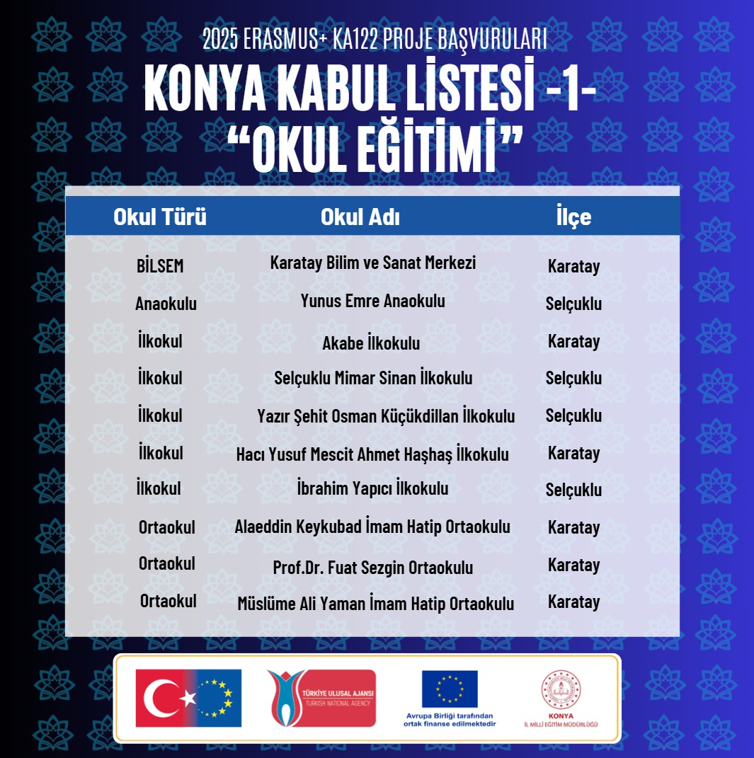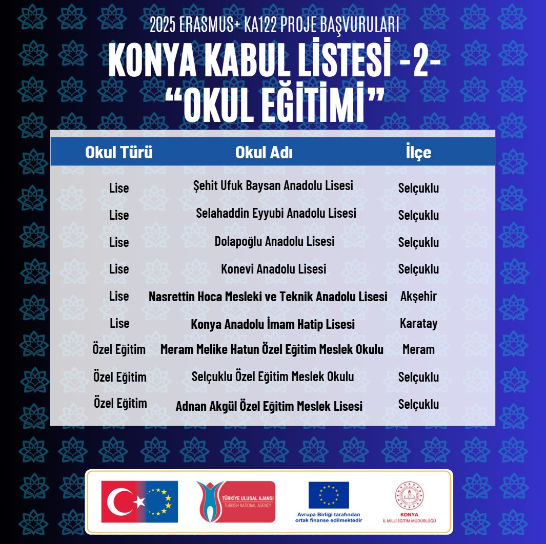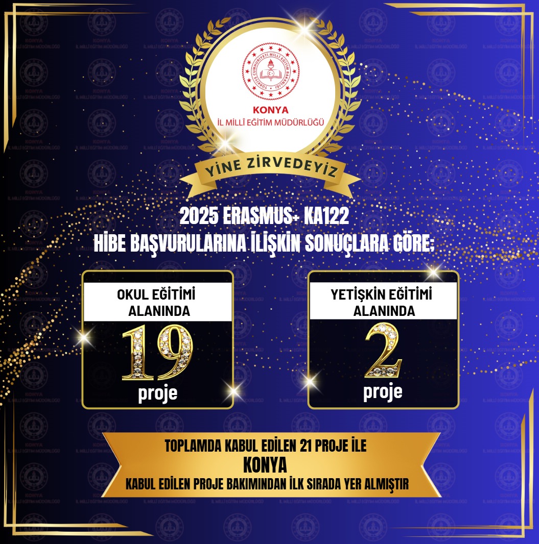 Konya, 2025 Erasmus+ KA122 kapsamında “Okul Eğitimi” ve “Yetişkin Eğitimi” alanlarında toplam 21 proje ile en çok kabul alan il oldu. Eğitimde uluslararasılaşma adına önemli bir başarıya imza atan projeler, şehrin 5 farklı ilçesindeki kurumlar tarafından yürütülecek.
