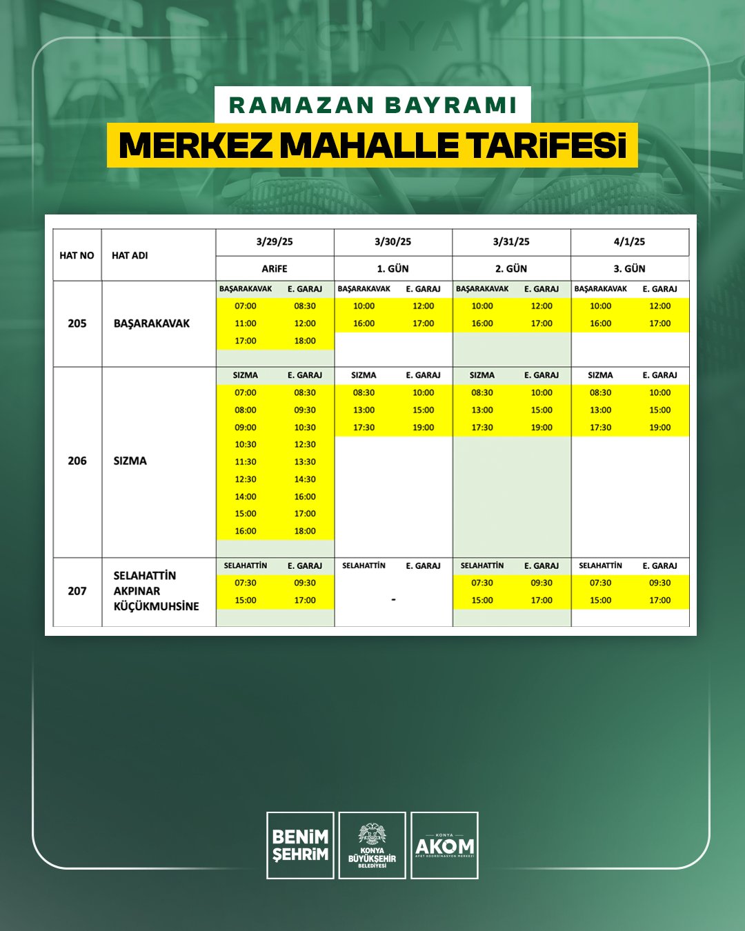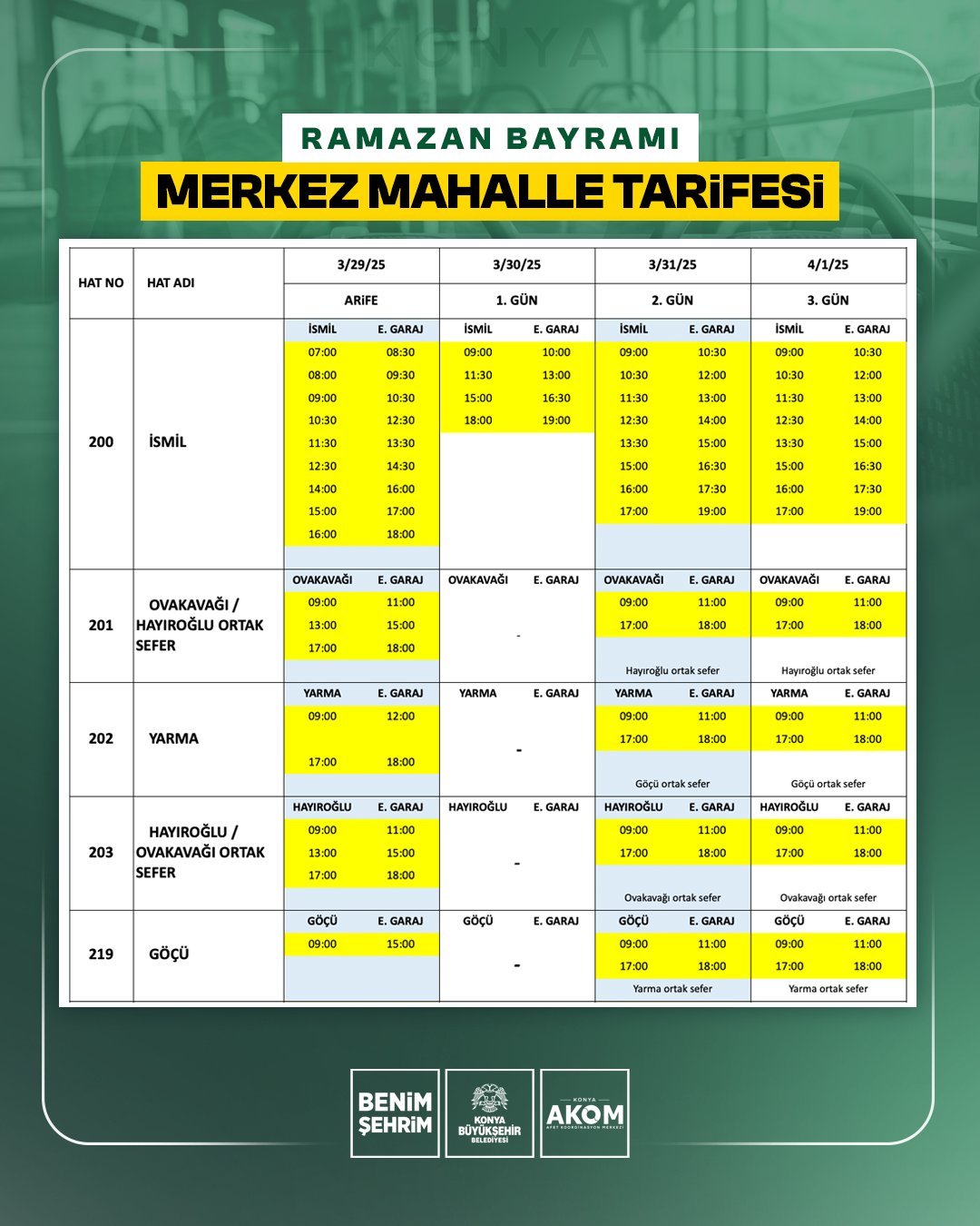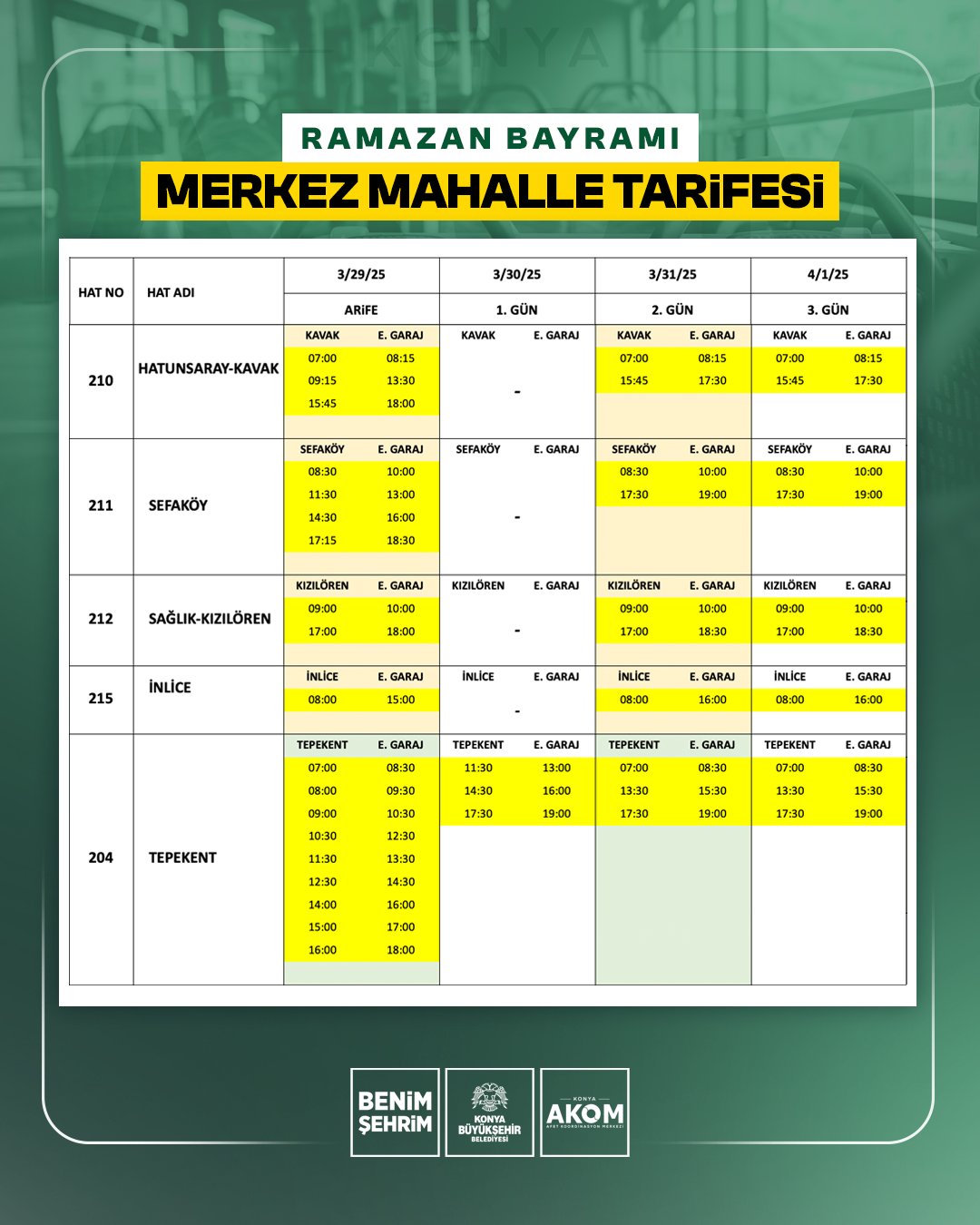 Konya AKOM, 29 Mart Arife Günü ile 1 Nisan (Bayramın 3.Günü) tarihleri arasında Merkez Mahalle Hatları'nın yolculuk saatlerini paylaştı.