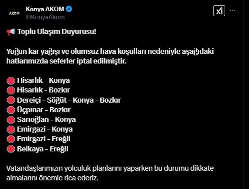 Konya Afet Koordinasyon Merkezi (AKOM), yoğun kar yağışı ve olumsuz hava koşulları nedeniyle bazı toplu ulaşım hatlarında seferlerin iptal edildiğini duyurdu. Vatandaşlara, mağduriyet yaşamamaları adına planlarını bu duruma göre düzenlemeleri tavsiye edildi.