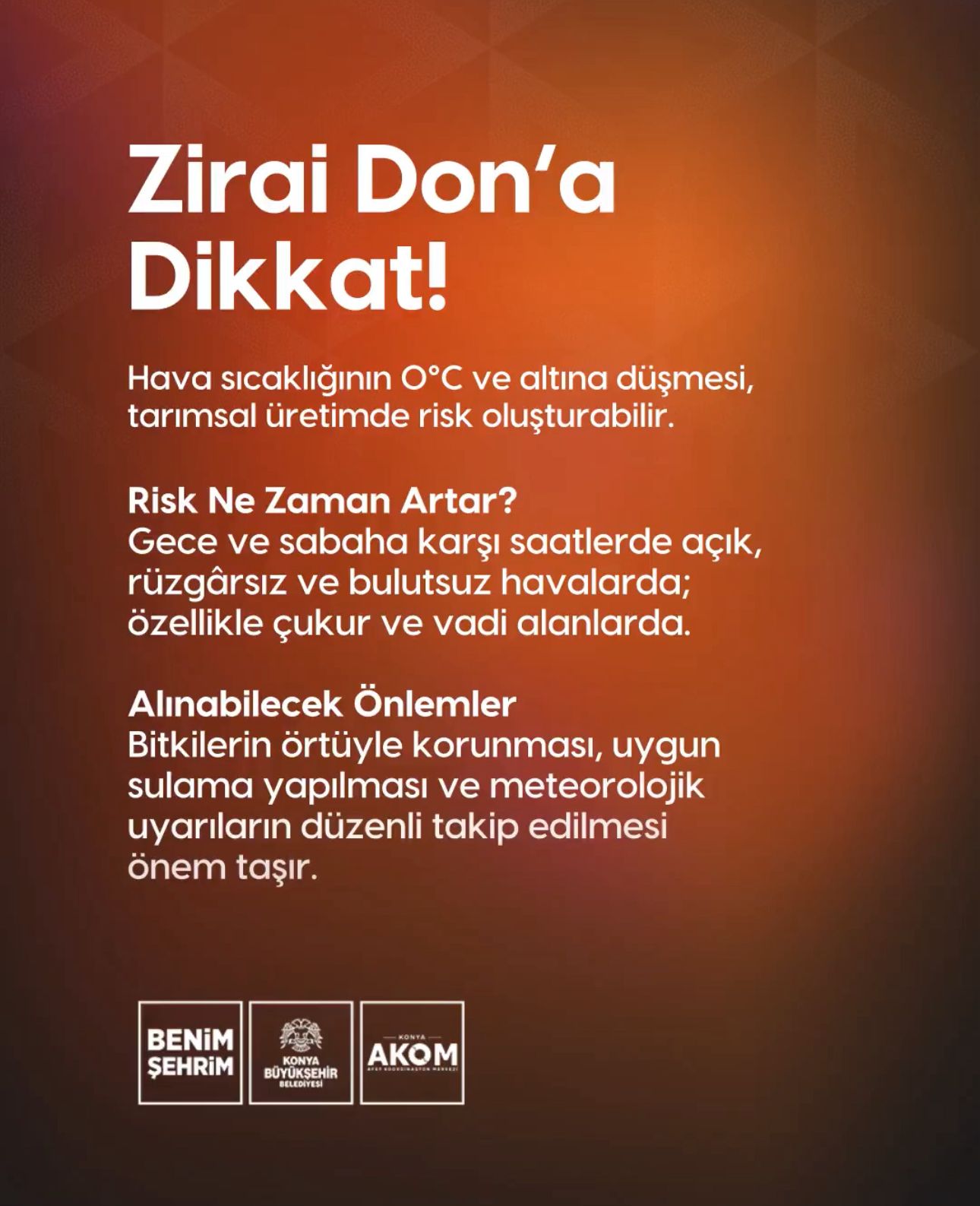 Konya Afet Koordinasyon Merkezi (AKOM) sosyal medya hesabından, çiftçileri zirai don tehlikesine karşı uyardı. Yapılan uyarıda, gece ve sabaha karşı saatlerde açık, rüzgârsız ve bulutsuz havalarda hava sıcaklığının 0 derece ve altına düşmesinin tarımsal üretimde ciddi risk oluşturabileceği belirtildi.