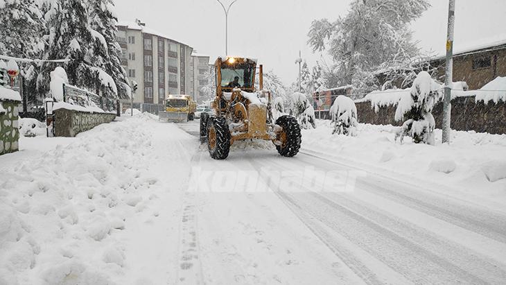 Konya'nın Seydişehir ilçesinde gece başlayan kar yağışı, etkisini artırarak devam ediyor. Belediye ekipleri, karla mücadele çalışmalarını aralıksız sürdürüyor.Kar kalınlığı ilçe merkezinde 30, kırsal mahallelerde ise 60 santimetreye ulaştı.