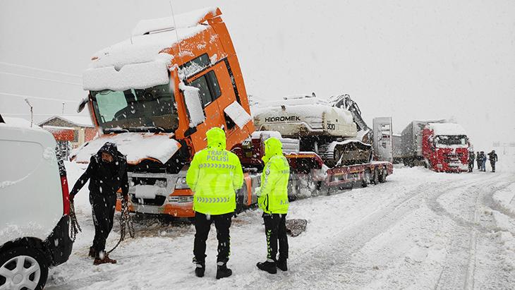 Karayolları ekipleri bir yandan karla kapanan yolların açılması için çalışmalarını sürdürürken, yolda kalan araçların kurtarılmasına da yardımcı oluyor.