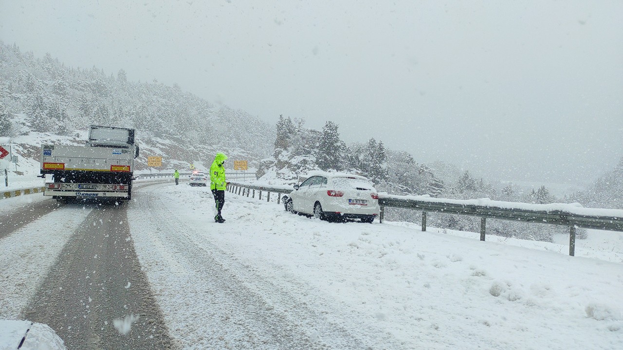 Konya'nın Seydişehir ilçesinde yoğun kar yağışı nedeni ile Konya-Antalya kara yolunda trafik kontrollü olarak sağlanıyor.