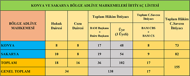 Buna göre, Konya Bölge Adliye Mahkemesi için 8 Hukuk Dairesi ve 8 Ceza Dairesi'ne toplam 73 hakim ve cumhuriyet savcısına ihtiyaç duyulduğu listelendi.